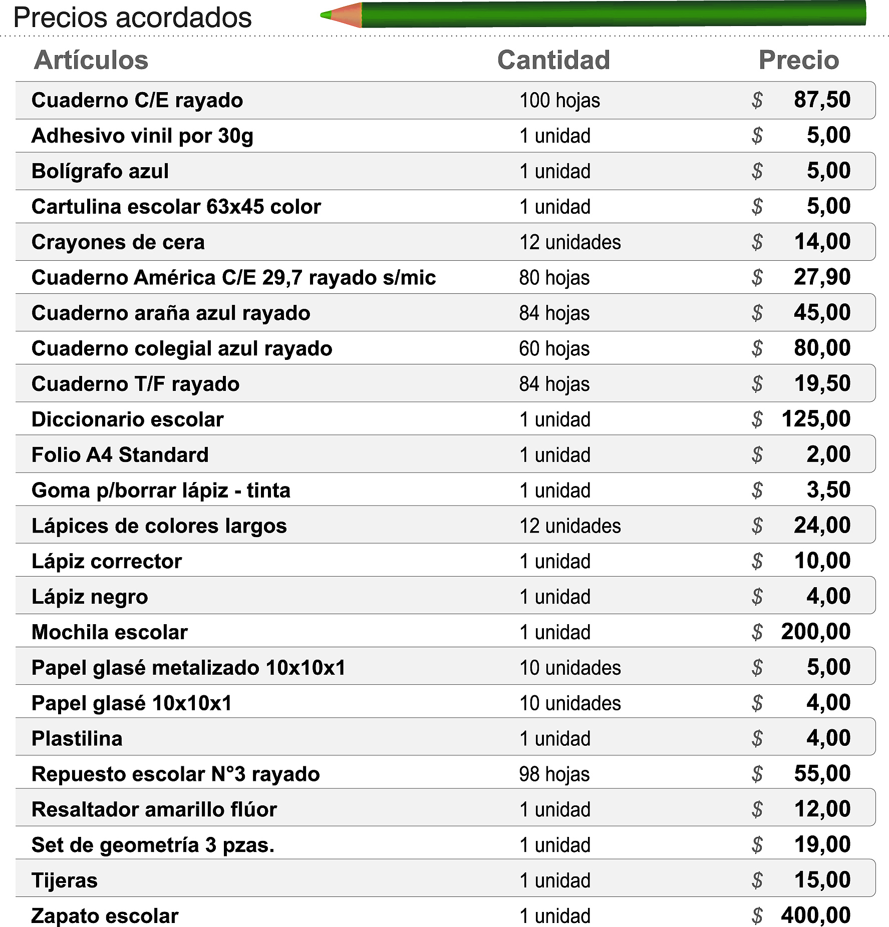 Entre los 24 artículos se encuentran por primera vez una mochila, por 200 pesos (ver infografía), y un par de zapatos para que los chicos vayan a la escuela, por 400 pesos, además de productos tradicionales como lápices, cuadernos, tijeras y gomas de borrar.