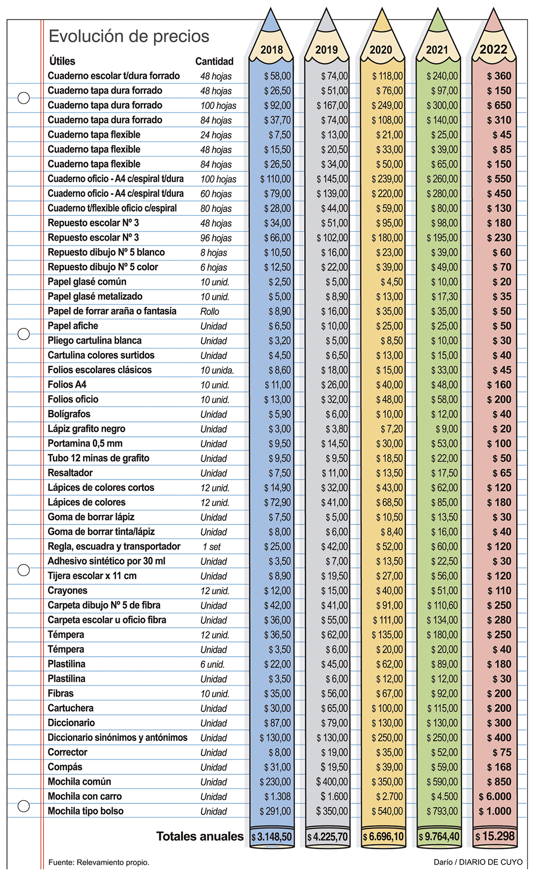 La canasta escolar con 51 artículos que DIARIO DE CUYO viene relevando desde hace 10 años en el mes de febrero llega este año con una suba promedio del 56,7% con respecto al año pasado. Pero lo llamativo es que desde el 2013, cuando comenzó a hacerse el informe, hasta el 2022, el incremento de los útiles escolares alcanzó el 415,2%, frente al 376,8% que sumó la inflación, según datos del INDEC, con una diferencia de 38,4 puntos. En la carrera ganó notoriamente el incremento de los elementos escolares.