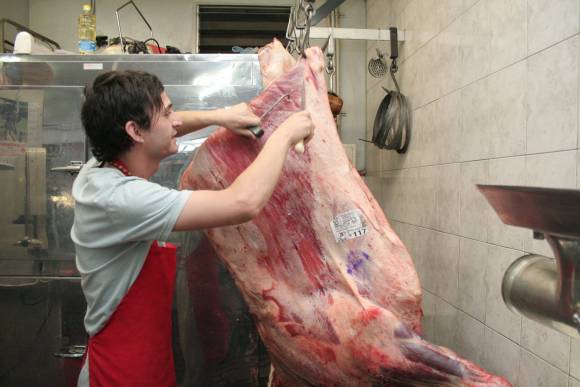 "El aumento por lo general es estacional, cuando se acercan las fiestas sube. Lo que pasa es que este año la sequía y la falta de carne hace que se potencie la suba", asegura Juan Carlos, propietario de Carnes Parras, quien resalta que el aumento ronda el 20%. La carne que llega a un frigorífico viene como media res, pesando unos 120 kilos promedio.