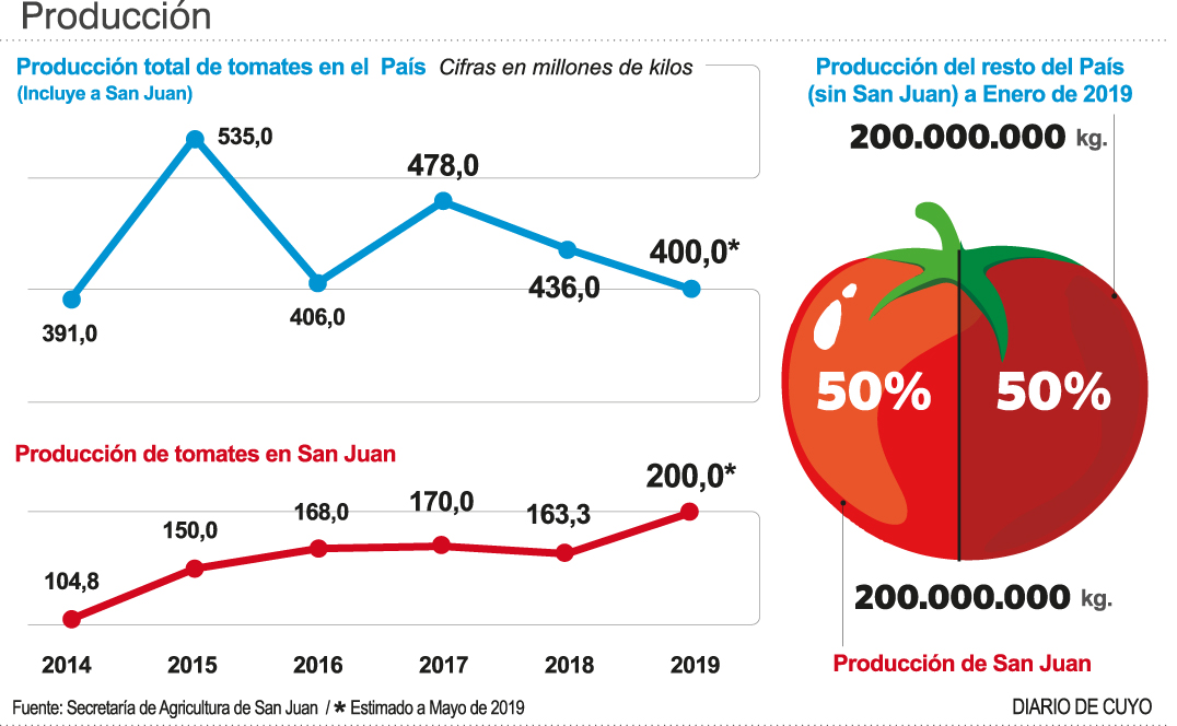 El año pasado el aporte tomatero local fue de 168 millones de kilos contra 437 millones en todo el país (ver infografía). La cosecha de tomates en la provincia comenzó la semana pasada pero el fuerte arrancó el 7 de enero y se extenderá hasta los meses de abril y mayo. El sanjuanino Guillermo Quiroga, presidente de la Asociación Tomate 2000, que nuclea a productores cuyanos, dijo que los tomates tempranos vienen con rendimientos parecidos a los del año pasado. Las cifras oficiales indican que fueron de 98.000 kilos por hectárea. Pero hay años como el 2017 en que se llegó a 105.000. A nivel nacional el rendimiento promedia los 70 mil kilos por hectárea.
