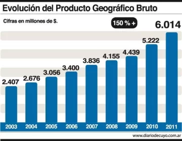 También, tomando como línea de base el año 2003, los indicadores del 2010 muestran que hubo un aumento del 150% en la economía de San Juan, alcanzando los 6.000 millones de pesos, como Producto Geográfico Bruto, PGR.