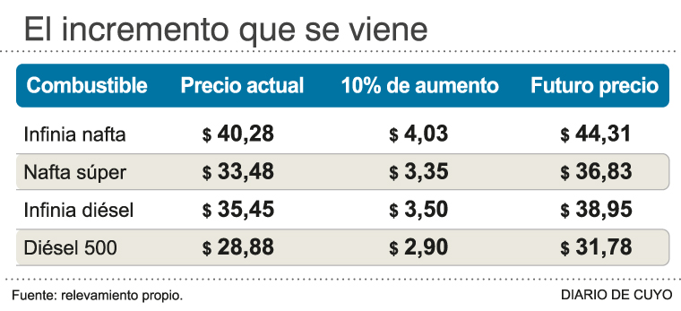 Es el porcentaje en promedio de la última suba de los combustibles, liderada por YPF, el domingo 19 de agosto pasado. Fue la segunda modificación de las tarifas dentro del mismo mes.