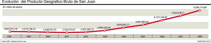 El Producto Geográfico Bruto (PGB) de la provincia de San Juan en el año 2008 fue $9.284.714.887, lo que implica que creció un 9,5% respecto al año anterior, según difundió ayer el Instituto de Investigaciones Económicas y Estadísticas.
