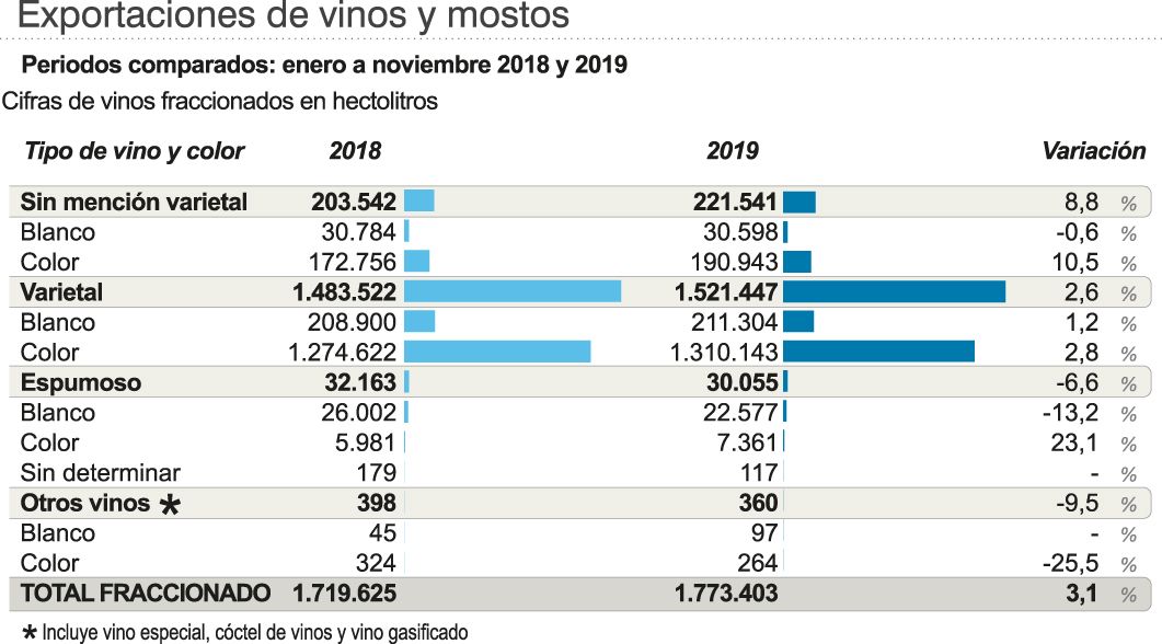 En los 11 meses del 2019 se exportaron 275,6 millones de litros de vino, un aumento del 8,9% respecto al periodo enero-noviembre del 2018, cifra que anticipa que al cerrar el año se consolidará la mejora de las exportaciones vitivinícolas tras el periodo negativo que vivió el sector en el 2018. En la Corporación Vitivinícola Argentina lo atribuyen a la devaluación y a la merma de la producción de uvas en Europa a causa del clima.