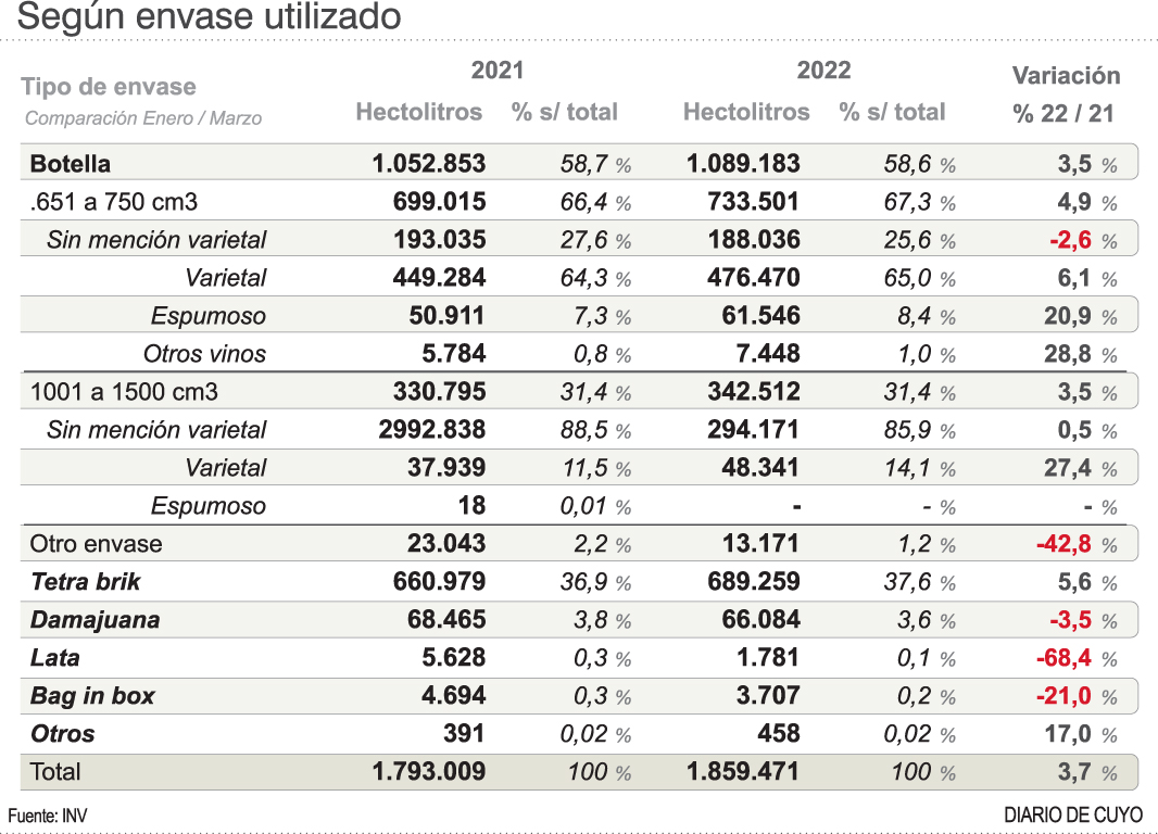 El INV informó que con valores positivos en todos los tipos de vinos, colores y una recuperación muy fuerte de casi todos los envases, marzo 2022 registró despachos por 71,5 millones de litros de vino, el mejor registro de los últimos 5 años.