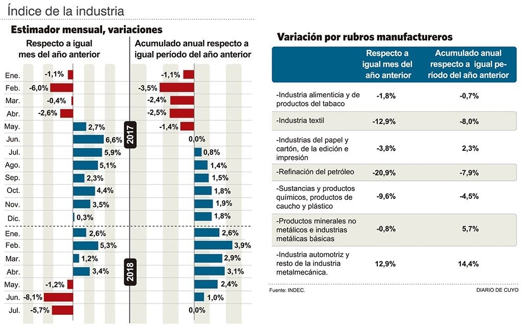La actividad industrial de Argentina registró una baja de 5,7% en julio respecto al mismo mes del año 2017 (ver infografía), según informó el martes pasado el Instituto Nacional de Estadística y Censos (INDEC). En el acumulado de los primeros siete meses de 2018 en su conjunto, el estimador mensual industrial (EMI) -que mide el desempeño del sector manufacturero- alcanza el mismo nivel que en igual período del año anterior, por lo que registra una variación interanual de 0,0%. Analizado por sectores, las caídas interanuales se observan en la refinación del petróleo (-20,9%), la industria del tabaco (-13,9%), la industria textil (-12,9%), los productos de caucho y plástico (-11,9%), la metalmecánica, excluida la industria automotriz (-11,9%), la elaboración de sustancias y productos químicos (-9,6%), la edición e impresión (-6,1%), el bloque de papel y cartón (-3,8%), la industria alimenticia (-1,8%) y los productos minerales no metálicos (-0,8%). Las únicas subas se registran en industrias metálicas básicas (13%) y en la industria automotriz (12,9%).