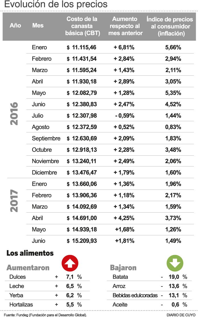 Según los datos de la consultora sanjuanina Fundación para el Desarrollo Global (Fundeg), el Índice de Precios al Consumidor (IPC) subió 1,49% en junio con respecto a mayo en esta provincia. Esto, sumado a la inflación del resto del año; totaliza un crecimiento en el costo de vida de 12,2% en el primer semestre y 26% si se compara un año entero, es decir, de junio de 2016 a junio de 2017. Respecto a lo que midió el Indec para el mismo mes -1,2% en junio, 12,2% el acumulado y 21,7% todo el año- revela que los precios se encarecieron mas en San Juan que en el resto del país. Incluso superaron a los de la región cuyana, que en el mismo periodo subieron 1,18%.