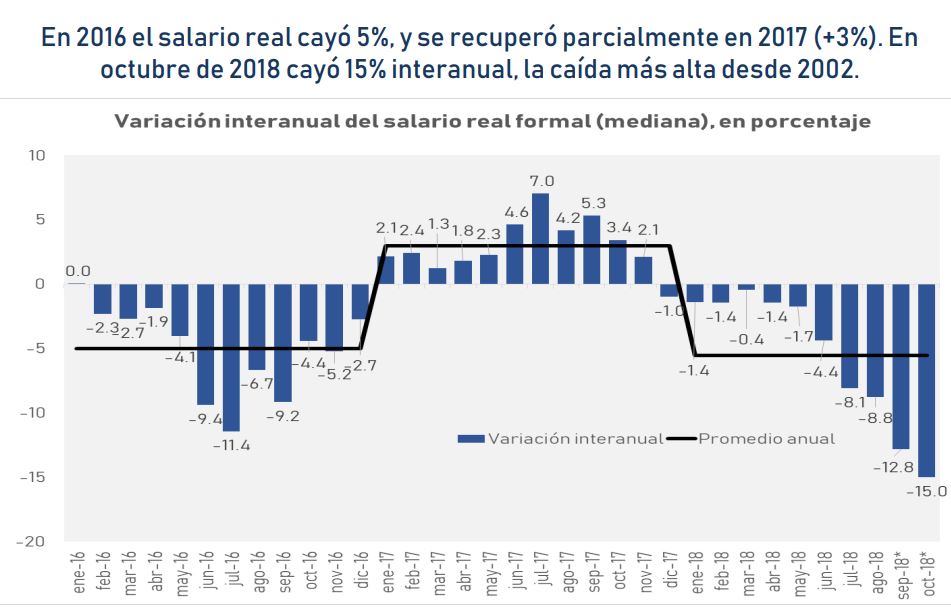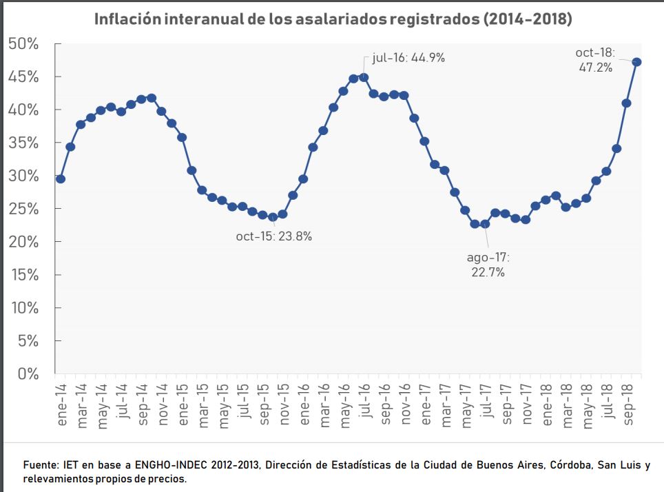 En los primeros diez meses de 2018, la inflación sobre los salarios registrados llegó al 40,9%, en tanto que en los últimos doce meses se ubicó en el 47,2%. De esta manera, 2018 será el año más inflacionario desde 1991, superando a 2002, 2014 y 2016.