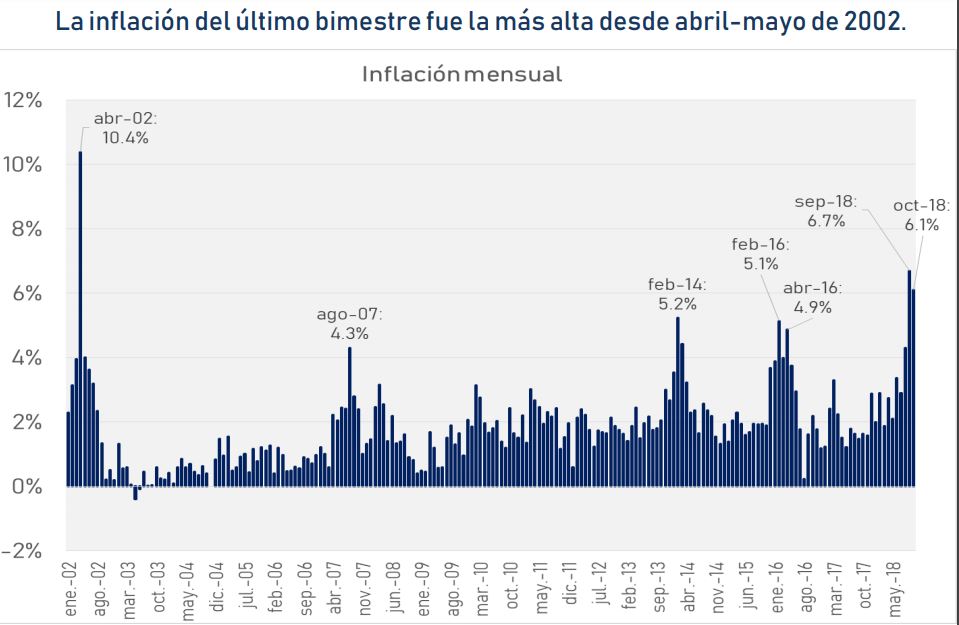 La inflación del 6,1% de octubre más el 6,7% de septiembre (que fue la marca más alta del año) dio un acumulado de 13,2% en el bimestre, por lo que fue más alta que la inflación registrada por Chile o Perú en los últimos cuatro años. En octubre siguió impactando fuertemente la disparada del dólar registrada en los últimos días de agosto, que lo llevó de $30 a la franja de los $36/$40.
