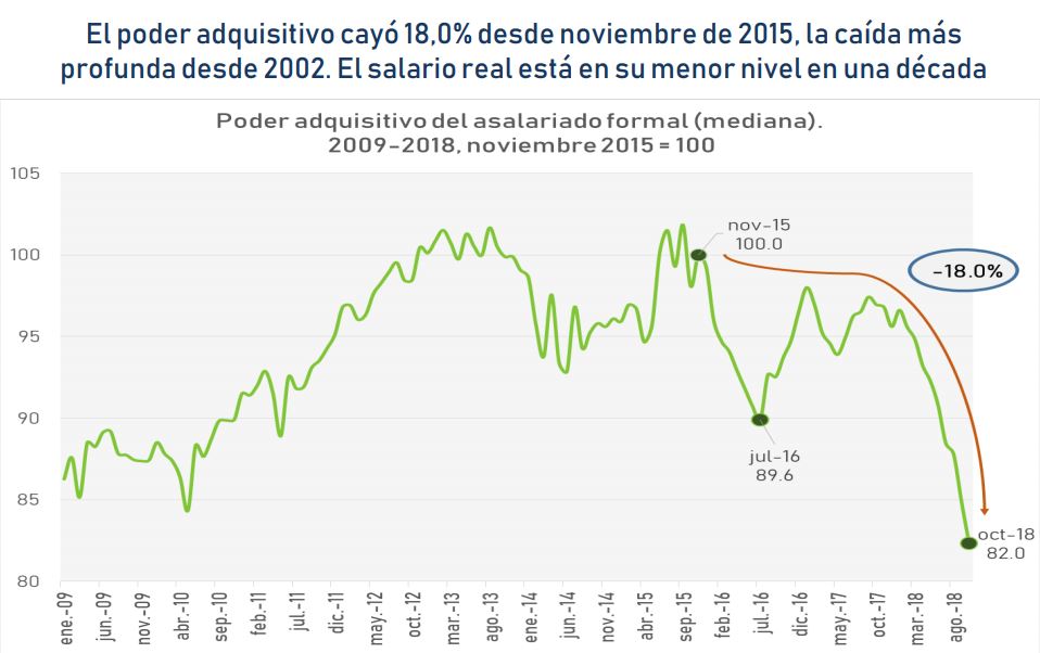 En octubre de 2018 el poder adquisitivo fue 18% inferior al de noviembre de 2015, dice el informe mensual el IET, que cuenta con apoyo logístico de la Universidad Metropolitana para la Educación y el Trabajo (UMET) y el respaldo de 45 gremios de la CGT y la CTA.