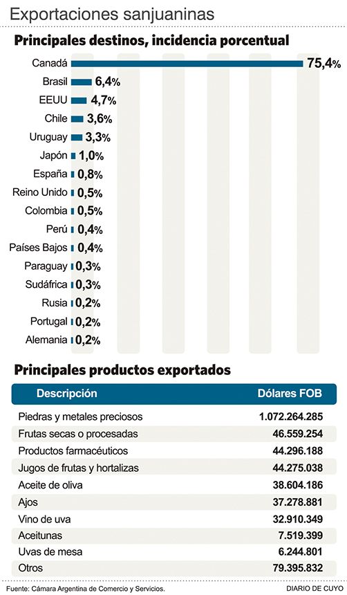 Según los datos conocidos, de los 1.433 millones de dólares exportados, el principal país de destino fue Canadá, de donde es la minera Barrick, la socia junto a la china Shandong Gold del emprendimiento minero Veladero, ubicado en Iglesia. Hacia ese país fueron el 75,4% de las ventas al exterior locales, mientras que lejos, en el segundo lugar, se ubicó Brasil, con el 6,4% de las exportaciones sanjuaninas. A este último destino fueron productos como frutas secas, aceite de oliva y ajos.