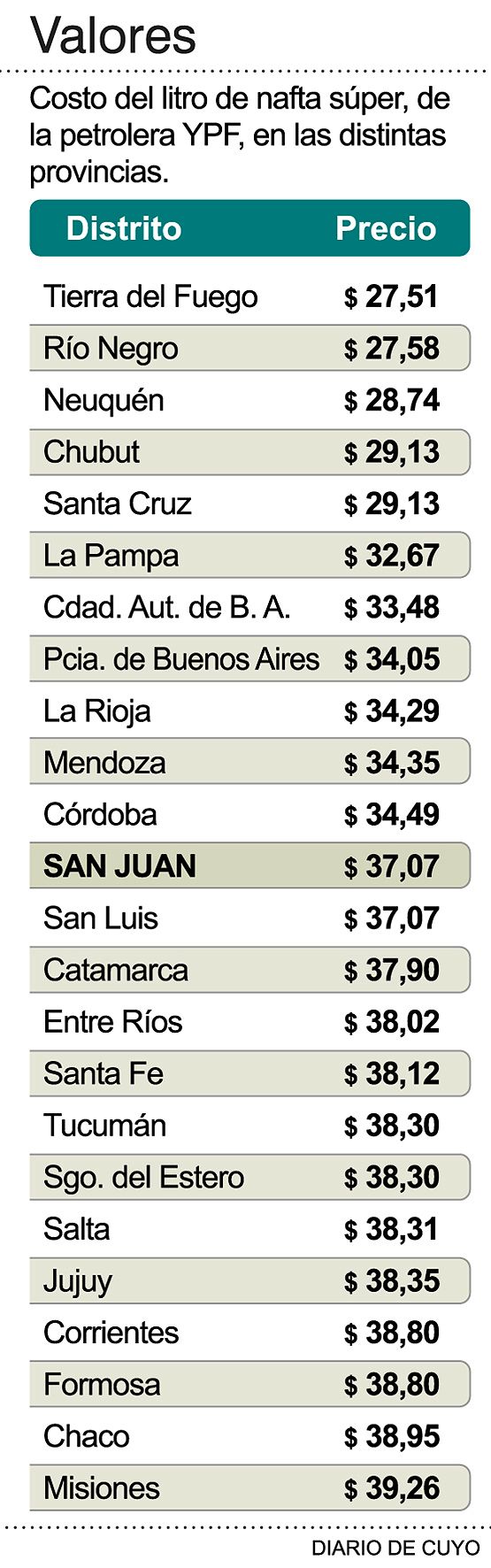 Tomando en cuenta la página Precios en surtidor, de la Secretaría de Energía de la Nación, donde figuran los valores de los combustibles de todo el país, se confeccionó un listado que arroja para la Súper de la petrolera YPF que el monto más barato se encuentra en Tierra del Fuego, con 27,51 pesos, mientras que el más caro está en Misiones, con 39,26 pesos.