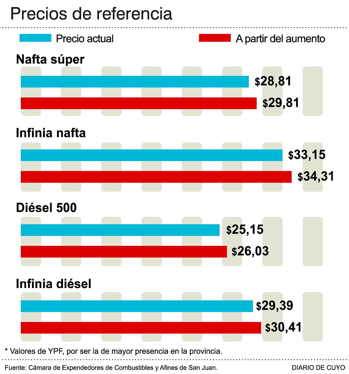 Hasta ayer no había llegado la comunicación oficial de las petroleras a las estaciones de servicio pero desde la Cámara de Combustibles de San Juan aseguraron que en los primeros días de julio vendrá un incremento en las naftas de hasta el 3,5%. Con este nuevo ajuste el precio del combustible llegará a un acumulado del 21,5% en el 2018. Luego aseguran que vendrán varios aumentos mensuales y consecutivos. El número exacto del nuevo aumento dependerá de cada petrolera que puede retocar unos centavos menos, pero tomando los precios de referencia de YPF que es la firma dominante del mercado local, el precio de referencia de la nafta Súper pasará a costar $29,81 en esta provincia -$1 peso más que ahora-; en tanto que la Premiun superará los $34. En el caso del gasoil, el común alcanzará los $26 mientras que el Premiun pasará la barrera de los $30 (ver infografía).