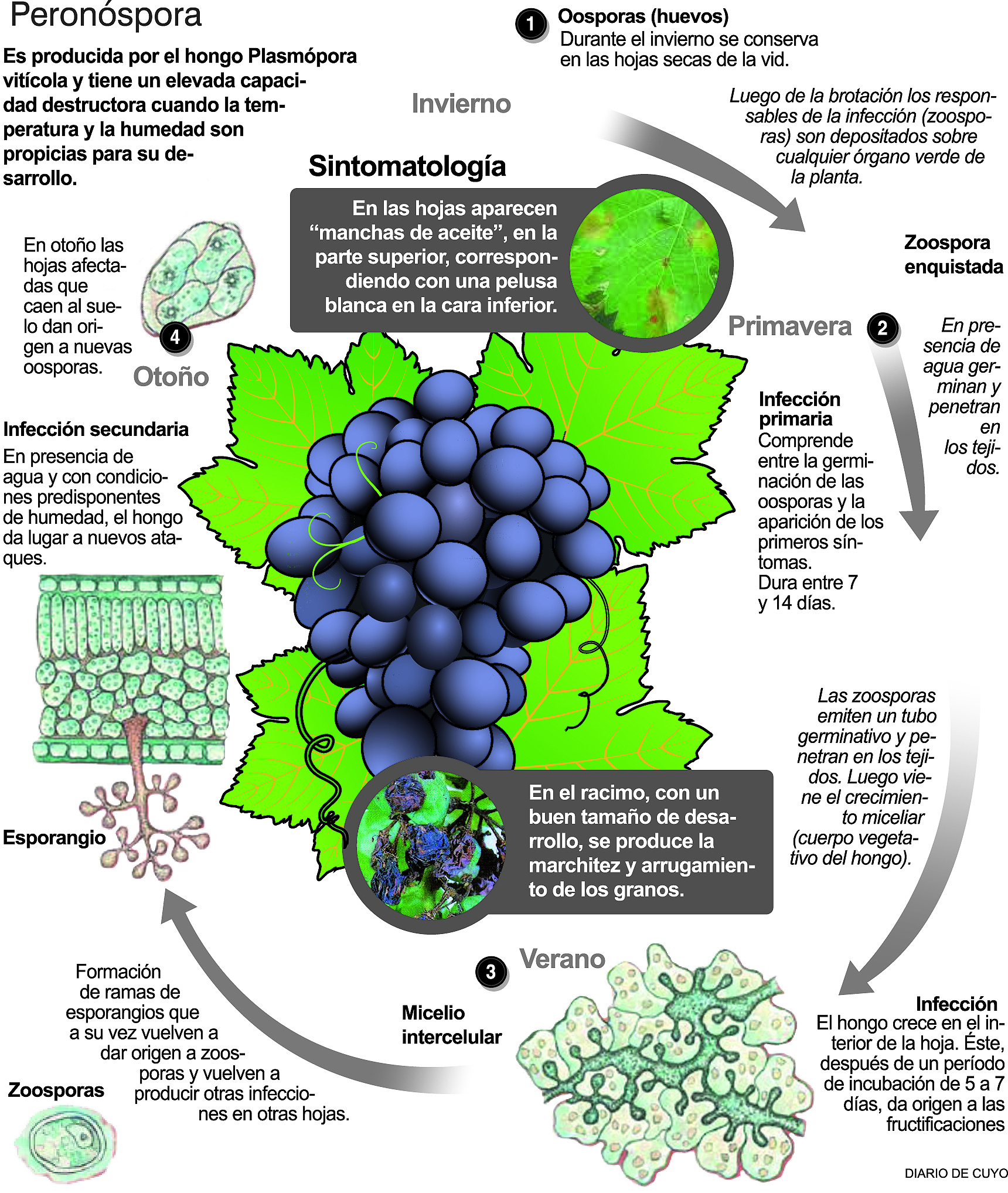 Los técnicos del INTA descubrieron ahora focos activos de peronóspora -otra de las enfermedades de los viñedos este verano, que se ha presentado lluvioso y con alta humedad- y ayer dieron un alerta para que los productores realicen los controles y salgan a darle pelea con las aplicaciones necesarias de fitosanitarios para detener los daños. El riesgo es grande porque la enfermedad deja al parral sin hojas en pocos días y eso evita que el grano madure, dejándolo directamente sin producir. La gran preocupación es para el grueso de uvas sanjuaninas que se van a cosechar en marzo y en abril, ya que la enfermedad amenaza con ocasionar fuertes pérdidas.