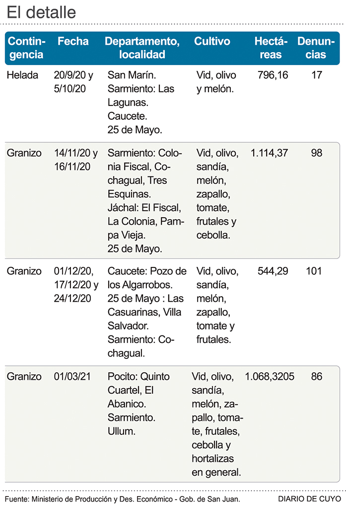 En la peor temporada de daños climáticos en los cultivos desde el 2016, y tras evaluar el informe oficial de las pérdidas que causaron las heladas y tormentas graniceras en los últimos seis meses en vides y hortalizas; ayer la Comisión Provincial de Emergencia Agropecuaria declaró el Estado de Emergencia y/o Desastre Agropecuario para 1.300 hectáreas y 302 productores de siete departamentos, que son San Martín, Sarmiento, Caucete, 25 de Mayo, Jáchal, Pocito y Ullum. El 15 % de esa superficie -200 ha- sufrió pérdidas que superan el 80%, principalmente en las zonas de Quinto Cuartel y El Abanico, en Pocito, en Sarmiento y en Ullum, tras las últimas tormentas graniceras y crecientes del 1 de marzo, por lo que se considera zona de desastre. En las restantes 1.100 hectáreas los daños van del 50% al 80% y es zona de emergencia (ver infografía). Pero los cuatro accidentes climáticos -ocurridos el 20 de septiembre (heladas), y las granizadas del 14 y 15 de noviembre, del 1 de diciembre y el 1 de marzo pasado- en realidad afectaron a más zonas. En total las denuncias recibidas alcanzaron a 3.500 hectáreas, pero el 63% tuvo daños inferiores al 50% y por lo tanto no ingresan en la declaración de emergencia que ahora pasará a la firma del decreto del gobernador Uñac, para luego ir a pedir fondos y alivios impositivos nacionales. ""Esas hectáreas que también fueron afectadas por el clima en menos del 50% recibieron ayudas monetarias a través del Programa provincial de contingencia climática, que hasta ahora ha repartido 7 millones de pesos", explicó el ministro de Producción, Andrés Díaz Cano, quien ayer presidió el encuentro. En la reunión de la Comisión ayer se reunieron todas las entidades productivas de la provincias -viñateras y de chacareros-, funcionarios del INTA, de la Secretaria de Energía y Agua, del Prosap, de Hacienda y de Producción.