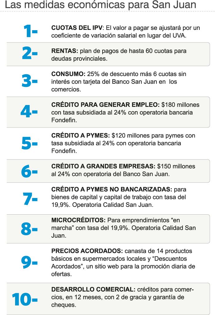 A través del Fondo de Financiamiento de Inversiones Productivas (Fondefin), y con operatoria bancaria, se lanzarán dos nuevas líneas de créditos. Una será de $180 millones de créditos para pymes y minipymes, con tasas subsidiadas al 24% para proyectos que incorporen mano de obra. Otra línea será de $120 millones, con la misma tasa y para los mismos beneficiarios, para créditos destinados a capital de trabajo. Luego, a través de la operatoria del agente financiero de la provincia -el Banco San Juan- se pondrá en marcha una línea por $150 millones crédito para Grandes empresas, para capital de trabajo, con tasas del 24% anual. La agencia Calidad San Juan ofrecerá dos líneas: una consistirá en créditos para pymes y minipymes no bancarizadas que podrán solicitar hasta $800.000 para bienes de capital y hasta $600.000 para capital de trabajo con tasa del 19,9% anual. Otra línea será de microcréditos, de hasta $100.000; para emprendimientos "en marcha" con tasa del 19,9%. Los comercios contarán con una línea especial denominada "Programa de desarrollo comercial", que otorgará hasta $100.000 para financiamiento de proyectos de ampliación, refacción de locales, adquisición de equipos y compra de mercadería, destinado a pequeños, medianos y micro comercios sanjuaninos. Tendrán un plazo de devolución de hasta 12 meses con 2 meses de gracia y garantía con cheque propio o de tercero.