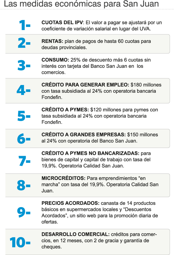 El gobernador Sergio Uñac presentará esta semana un paquete de diez medidas para atenuar el impacto de la crisis intentando sostener la actividad económica y el empleo, y que tendrán ejes en el beneficio social, las pymes y el consumo y los precios, según informaron fuentes oficiales. DIARIO DE CUYO tuvo acceso a un borrador que da cuenta de las iniciativas que serán lanzadas, y entre las novedades más fuertes está la modificación de la ley para cobrar las cuotas de las casas que entrega el Instituto Provincial de la Vivienda mediante un coeficiente adecuado a la realidad salarial del trabajador, y con topes a las cuotas; y un plan de 60 meses para pagar deudas vencidas en la Dirección General de Rentas. También habrá un relanzamiento con mayor énfasis en las líneas de créditos a tasas subsidiadas, muy por debajo de las de mercado; planes de cuotas sin interés en los comercios y la continuidad del programa de precios en los supermercados locales que agregará una novedosa estrategia de ofertas diarias, entre otras. Uno de los puntos en relación al IPV es que se va a modificar el criterio de ajuste del valor de la vivienda: el gobierno va a emitir una nueva ley para reemplazar las Unidades de Valor Adquisitivo (UVA), que emite el Banco Central y que utiliza actualmente para cobrar las cuotas, por un coeficiente de variación salarial promedio. Las cuotas tendrán como límite el 20% de los ingresos del grupo familiar. En este punto, pensando en la gente que quiera pagar, si el salario no aumenta tampoco subirá la cuota. Fuentes oficiales explicaron que para obtener el índice se hará un promedio de ingresos, entre los salarios que lograron ajustes más altos y los que obtuvieron menos porcentaje en paritarias. En cuanto a las deudas impositivas, se decidió extender las facilidades de pago a los deudores de impuestos provinciales con un plan de 60 cuotas. No se trata de una moratoria porque esta implica quita de capital o de intereses. Aquí lo que se hará es extender el plazo de pago que actualmente es hasta 24 cuotas. Con esto se buscará equiparar el plazo que instrumentó la AFIP a nivel nacional.