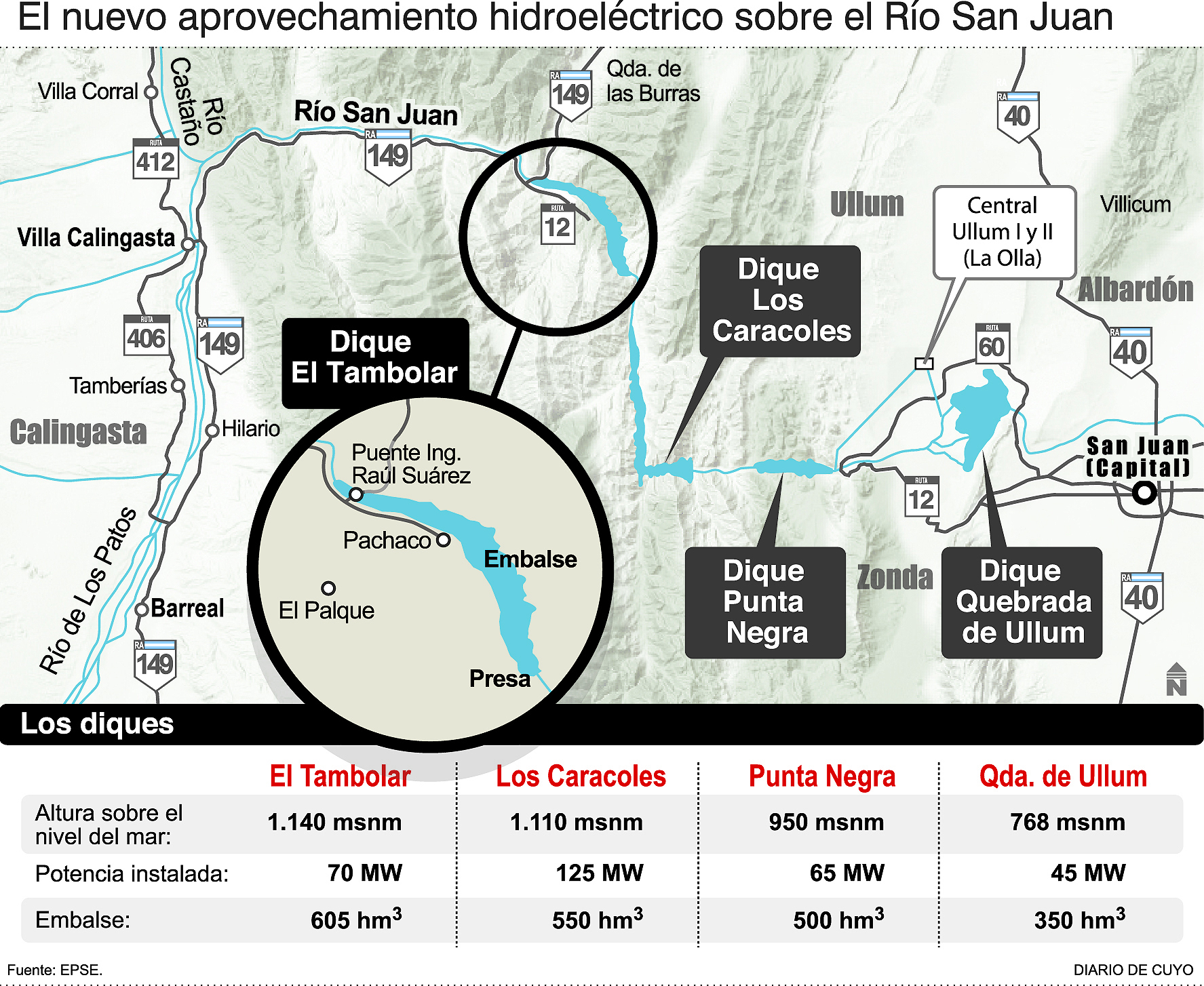 El Tambolar es el cuarto dique que se planificó sobre las aguas del río San Juan y es el que tendrá la mayor capacidad de embalse de todos, convirtiéndose en clave para funcionar como reservorio de agua y generación de energía. Está planificado a 1.440 metros sobre el nivel del mar, su potencia instalada será de 70 MW y con una capacidad de embalse de 605 hm3.