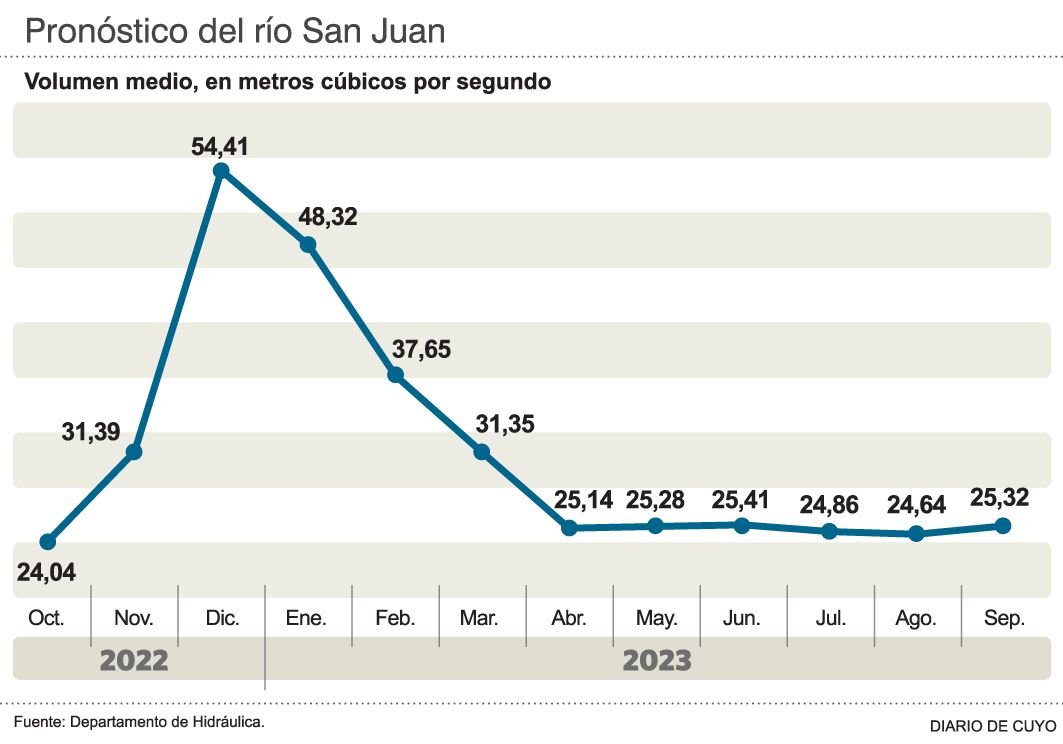 En este panorama, el secretario del Agua, Ramiro Cascón, sostuvo que "tenemos cautela y estamos realizando un seguimiento permanente del agua que trae el río San Juan". El funcionario dijo que no puede garantizar que habrá agua suficiente y que todo depende del comportamiento del curso de agua. Por ejemplo, hasta unos 10 días atrás traía 20 m3/s y ahora subió a 27 m3/s. Según los datos que manejan en el Departamento de Hidráulica (ver infografía) el pico de este verano, en diciembre, rondará en poco más de 54 m3/s, pero no se sabe si ese caudal servirá para mejorar sensiblemente la situación actual del embalse. Es que si bien hasta ayer hubo cortes en el regadío para mejorar las situación de los diques, desde hoy se volverá a desembalsar agua a razón de 35m3/s, es decir que saldrá más agua de la que entra por estos días.
