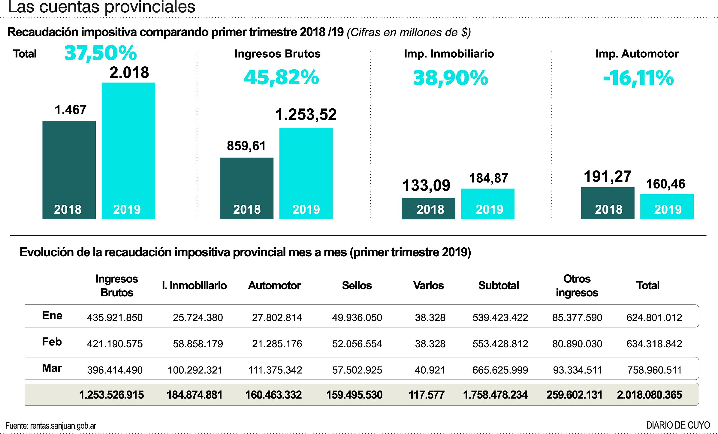 Entre enero y marzo la provincia de San Juan recaudó 2.018 millones de pesos por los impuestos locales, según informa la página oficial de Ministerio de Hacienda, mientras que en igual periodo del año pasado la cifra rondaba los 1.468 millones de pesos.