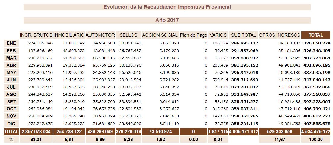A las arcas provinciales, en 2017 ingresaron $4.534 millones de pesos, contra $3.324 millones que habían recaudado un año atrás, por lo que en el año que hace días cerró el crecimiento en concepto de ingresos fue un 36,4% más que en 2016.