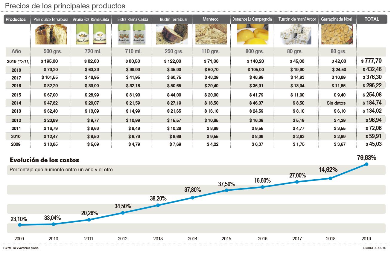 La canasta con ocho artículos navideños que todos los años para esta época releva DIARIO DE CUYO arrojó que para el 2019 aumentó su valor el 79,83%. Se trata de la suba más alta de, al menos, los últimos 11 años, y se da en un contexto en el que los incrementos de precios de los alimentos están a la orden del día. Este año el costo de la mercadería asciende a los 777,70 pesos, mientras que el año pasado alcanzaba a los 432,46 pesos.