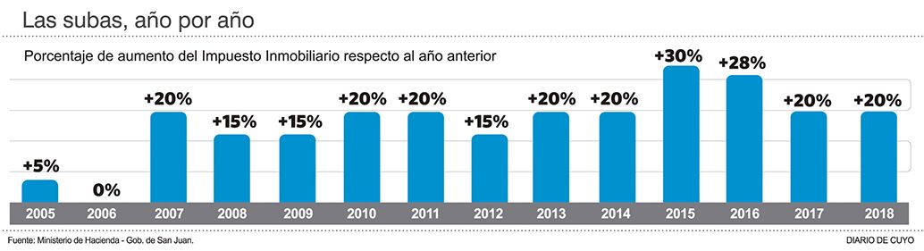 En San Juan el avalúo de los inmuebles se mantuvo sin cambios por muchos años, hasta que comenzó a reajustarse en la provincia a partir del año 2005 (en la época del 1 a 1 no se tocó y tampoco en los primeros años tras la devaluación). En los años 2015 y 2016 la provincia realizó fuertes ajustes y las subas rondaron entonces el 30% en las boletas. El incremento de este año se asemeja a las subas anteriores que oscilaron entre 15 y 20%.