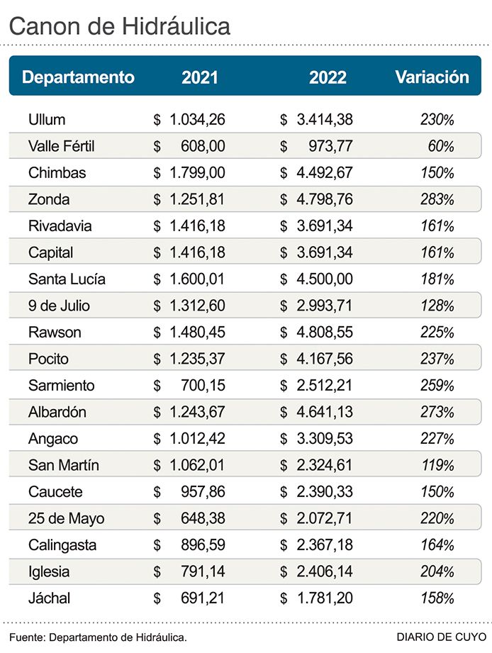 Toda la cuestión se da cuando están al cobro las boletas del canon anual correspondientes al 2022, que empezarán a vences el 10 de mayo próximo, pero con aumentos significativos (ver infografía), que llegan al 283%, como en el caso de Zonda, donde pasaron de pagar por hectárea por año, de $1.251,81 en el 2021 a $4.798,76. En la otra punta de la tabla está Valle Fértil, donde el año pasado pagaban $608 y ahora subió a $973,77.