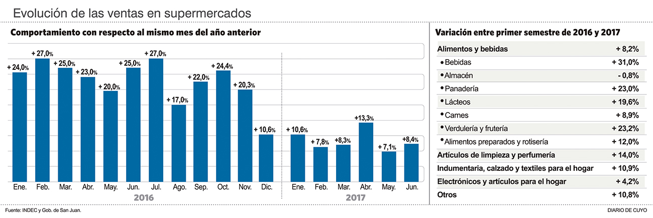 En el acumulado de enero a junio de 2017 las cadenas sanjuaninas vendieron $1.791.431.000, un crecimiento del 9,3% respecto al mismo periodo del año pasado, siempre en pesos corrientes.