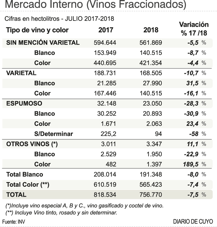 A principios de agosto el Instituto Nacional de Vitivinicultura (INV) dio a conocer el primer repunte de exportaciones de vinos después de 31 meses, especialmente del granel que creció 150% en el mes de julio pasado, y una suba del 18% en ventas del fraccionado. Ahora se acaba de difundir el comportamiento del otro frente de la industria vitivinícola -la venta en el mercado interno-, y no corrió con la misma suerte del exportador: los despachos para consumo doméstico totalizaron en julio 776.770 hectolitros, lo que implicó otra fuerte caída del 7,5% en volumen frente a igual mes del año pasado (ver infografía). La caída se concentró en los vinos varietales, cuyas ventas bajaron 10,7%, especialmente en los tintos que están en un escalón superior de precios, con una caída del 16%. En contraposición, los blancos que son un poco mas baratos que los de color, subieron 31,5%.