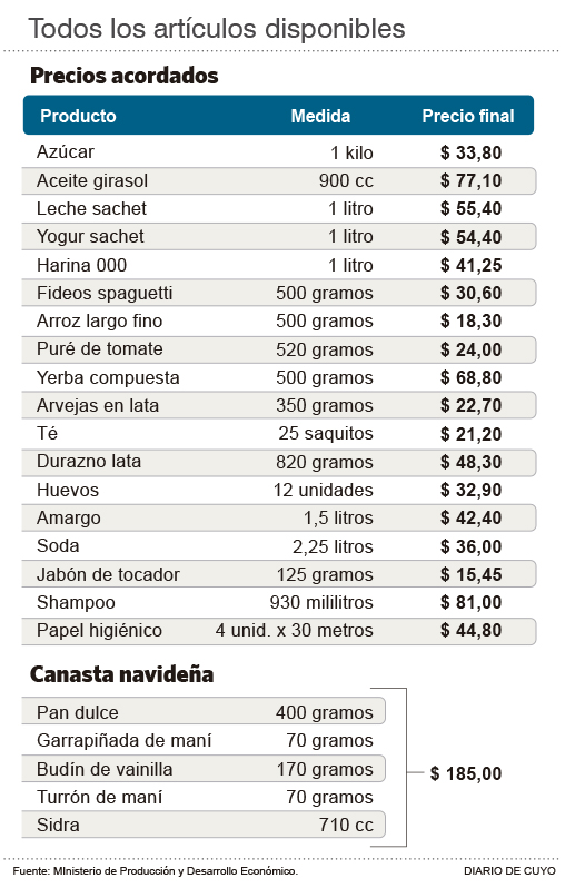 En diferentes puntos de la provincia de San Juan ya se puede comprar una canasta navideña por 185 pesos, un monto bajo que los empresarios asociados a la Cámara Sanjuanina de Supermercados y Autoservicios (Cassa) acordaron ofrecer para estas fiestas, y que resulta hasta 43% más barato que lo que valen esos artículos en el mercado. Un dato interesante es que la oferta está disponible no sólo en la Capital sino también en los supermercados locales de Chimbas, Albardón, Angaco, Rivadavia, Pocito, Rawson, Iglesia, 25 de Mayo, Santa Lucía, Jáchal y Calingasta. En total, son 23 los supermercados que participan. La iniciativa se logró gracias a un acuerdo celebrado ayer con el Ministerio de Producción, en el cual los supermercados locales (no las cadenas) además acordaron sostener hasta el 31 de diciembre un listado de Precios Acordados con 18 productos de la canasta familiar.