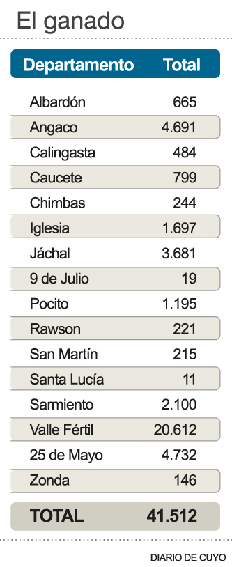Según la vacunación contra aftosa realizada este año en San Juan el ganado vacuno alcanza unas 41 mil cabezas (ver infografía) siendo el departamento Valle Fértil el principal productor. Pero los cálculos del gobierno indican que el rodeo provincial alcanza las 60 mil cabezas. La producción anual de carne abastece el 10 por ciento del consumo local, que es más de 37 millones de kilos de carne bovina por año. El resto ingresa a través de abastecedores.
