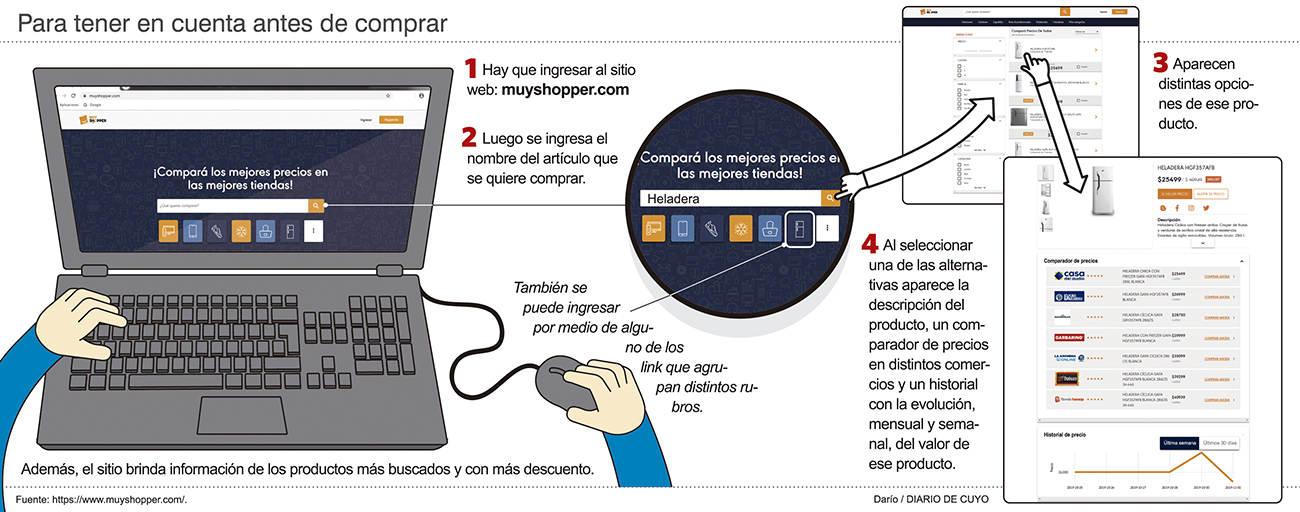 Del lunes 4 al miércoles 6 llega una nueva edición de uno de los eventos importantes en el calendario para comprar por internet con rebajas -el Cyber Monday-, y ante esa circunstancia se está difundiendo una App que aleja al consumidor de las ofertas "engañosas": la aplicación se llama "Muyshopper.com" (www.muyshopper.com), es de fácil consulta, y permite comparar el precio del producto entre un centenar de locales que venden on line, lo que permite realizar una búsqueda más eficiente y ahorrar hasta 40%. Pero además de práctico, ofrece algo muy novedoso como es el historial de precio del articulo en cuestión, y el consumidor puede comprobar si la oferta es real. Es que en los últimos años vienen levantando sospechas los descuentos que ofrecen este tipo de eventos on line como el Cyber Monday, Black Friday y Hot Sale, ya que no son pocos los consumidores que señalan que algunos productos suben de precio en esas fechas y la rebaja promocional termina siendo falsa o engañosa. Si alguien se registra en el sitio podrá recibir alertas del producto que elija avisando cuando baja de precio. La aplicación fue creada por tres emprendedores cordobeses Maximiliano López (34), Ari Lapid (30), ambos licenciados en Administración de empresas, y Arian Giles García (28), licenciado en Ciencias de la Computación. Los tres son egresados de la Universidad Nacional de Córdoba, y según contó López la idea de diseñar esta aplicación fue para no pagar de mas. "Arrancamos con un sitio más chiquito a principios de 2018, pero como vimos resultados logramos un subsidio nacional para emprendedores y eso nos ayudó para armar y diseñar el resultado del producto, un sitio que compara todos los productos de electro y al que fuimos agregando otros", contó. Hoy las categorías que releva la aplicación están televisores, equipos de aire, lavarropas, ventiladores, microondas, hornos, cocinas, termotanques, calefones, celulares, notebooks, tablets, Pc, gamer, belleza, indumentaria y zapatillas. El Cyber Monday es una iniciativa de la Cámara Argentina de Comercio Electrónico (CACE), para promover las ventas online y también auspicia esta aplicación.