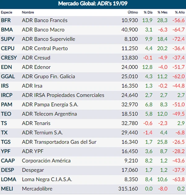En ese aspecto, destacó el rebote de precios en dólares de algunas acciones argentinas en Nueva York en lo que va de septiembre: BBVA Francés (+28,3%), Transportadora Gas del Sur (+25,8%), Central Puerto (+20,2%) y Banco Supervielle (+18,4%).