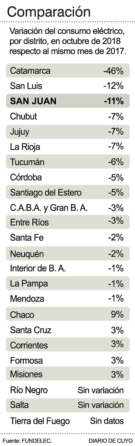 A eso se suma que habrá generación en los diques y se sumará la generación de un parque solar en Iglesia. Aunque nadie se anima a garantizar que no habrá apagones, estiman que puede ser un verano "tranquilo" en términos de cortes de servicios. Un dato importante es el comportamiento del consumo local, y al respecto, la Fundación para el Desarrollo Eléctrico (Fundelec) acaba de publicar las cifras de demanda de energía eléctrica de octubre donde San Juan, con una caída del 11%, es la tercera provincia donde más descendió, sólo superada por Catamarca (-46%) y San Luis (-12%). La media nacional muestra una caída de la demanda del 3,4% respecto a octubre de 2017, incluyendo a usuarios residenciales, comerciales e industriales de todo el país; aun con temperaturas similares a las del año pasado. La entidad indica que, más allá de las temperaturas elevadas y el factor estacional, se presentó el segundo consumo más bajo de todo el año y la marca más baja para el mes de octubre desde 2012 en términos nominales. El gerente general de la distribuidora Energía San Juan, Eduardo Tejada, lo atribuyó a los aumentos tarifarios. ""Lo que hay que tener en cuenta es que el costo de la energía ha subido tanto, que creo que la gente cuida el consumo y, por lo tanto, la demanda no ha estado aumentando", dijo y agregó que el consumo eléctrico sanjuanino lleva dos años repitiendo idénticas máximas de energía (no de potencia). Las proyecciones para el 2018 van a ser similares, a pesar del crecimiento demográfico. ""A esta altura del año se evidencian números negativos respecto al año pasado", concluyó Tejada. En la distribuidora contabilizan que en el 2016 la energía consumida fue 1.946 GWh, que era un 1% superior al 2015. En 2017 fueron 1.965 GWh, también un 1% más respecto al año anterior; es decir, números muy bajos. Respecto a la potencia, que es la demanda máxima que en un pico de temperatura se le exige al sistema, fue de 470 MW en el 2016 y de 482 MW en el 2017, es decir, una variación interanual del 2%. En Energía San Juan no tienen los datos cerrados del 2018, pero dijeron que ""todas las proyecciones indicarían que tendremos un comportamiento plano respecto a los años anteriores, con variaciones pequeñas".