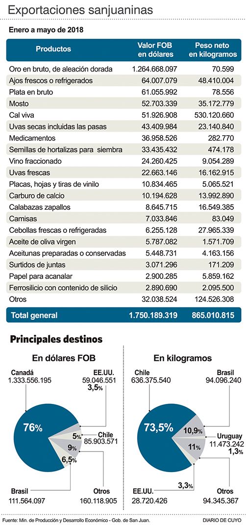 Entre enero y mayo de 2018 las exportaciones sanjuaninas no escaparon al impacto del difícil contexto nacional y lucen datos levemente positivos, pero en el Gobierno provincial están conformes justamente porque la mejora ocurre en un escenario desfavorable y el resultado podría haber sido adverso. En el acumulado de los primeros cinco meses las ventas provinciales al exterior muestran una suba del 6% en valores FOB y un aumento del 20% en cantidades, con envíos que totalizaron U$S 1.750.189.319 y un total en cantidades de 865.010.815 kilogramos; según informó la Dirección de Comercio Exterior, en base a datos del INDEC. La suba porcentual le pisa los talones a las exportaciones nacionales que en igual lapso subieron 7% (ver recuadro). Tomando como referencia los principales productos exportados, se puede observar que los mayores aumentos, en relación a 2017, se registraron en cebollas (517%), seguido por pasas de uva (75%), mosto (54%), camisas para hombres y niños (41%) y uvas frescas (25%). Además, por rubro, todos crecieron: la facturación de exportaciones agroindustriales crecieron 5%, la minería, el 7%; la cadena vitivinícola muestra una expansión del 31% y un 10% el sector industrial. Ante una realidad compleja, con inflación y altos costos internos que diluyen la mejora del tipo de cambio en las economías regionales, las autoridades locales sostienen que el crecimiento es alentador. Además aseguran que la provincia aportó su granito de arena a que los números sean positivos, al brindar créditos a tasa baja, subsidios del 20 al 25% a los fletes y programas de ayuda al empleo (Repip) que resultaron un alivio para las empresas exportadoras locales. ""Las exportaciones están aumentando pese al contexto, y la provincia sigue incentivando y ayudando además de las líneas de financiación, con mecanismos de promoción para ferias y giras comerciales", dijo ayer el ministro de Producción, Andrés Díaz Cano. El funcionario agregó que mantiene expectativas buenas para los próximos meses.