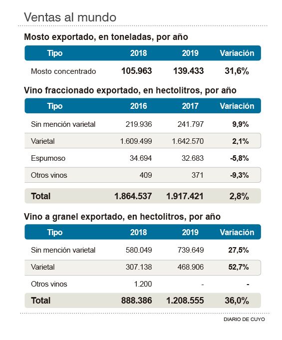 Las ventas al mundo de vinos alcanzaron en es período analizado un crecimiento menor, del 13,6% (ver aparte), con lo cual el mosto fue la "estrella" del 2019.