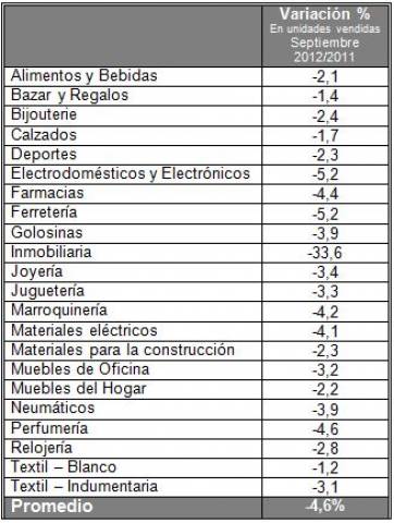 Buenos Aires, 4 de octubre.- Las cantidades vendidas por los comercios minoristas descendieron 4,6% en septiembre frente a igual mes del año pasado. Septiembre del 2011 resultó un mes muy bueno por lo que la base de comparación resulta significativamente alta. Es el séptimo mes consecutivo en que las ventas se retraen afectadas por un público más cauto y conservador en sus decisiones de gasto.