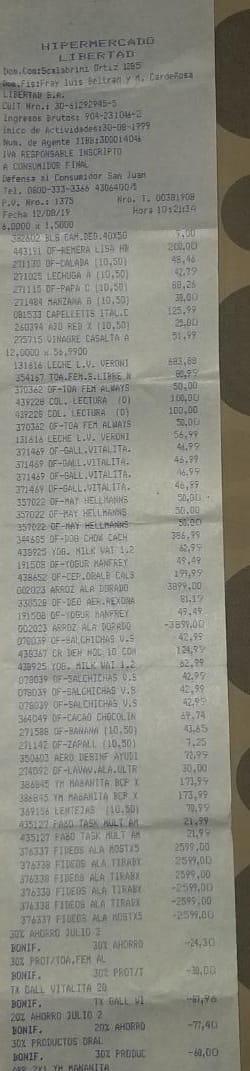 Una sanjuanina que fue a comprar como lo hace habitualmente se topó con una desagradable sorpresa en un reconocido supermercado. Es que a la falta de precios en algunos productos, se encontró con que le facturaron el arroz a $3.899 y los fideos a $2.599, según le contestaron desde la empresa "es para no venderlos".