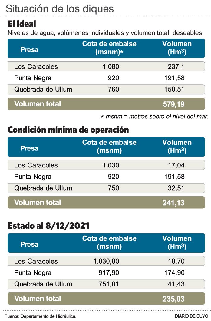 Según los números que dio a conocer Coria (ver infografía), hay una situación ideal, que incluso permite la generación en los tres diques, para lo que hace falta 579,19 hm3, según la cantidad de agua acumulada en los tres embalses. Y después hay una condición mínima de operación, en un contexto de sequía extrema como la que hay ahora, que consigna que deben haber 241,13 hm3. No obstante, según las cifras al miércoles 8, hay 235,03 hm3, sumando el agua total.