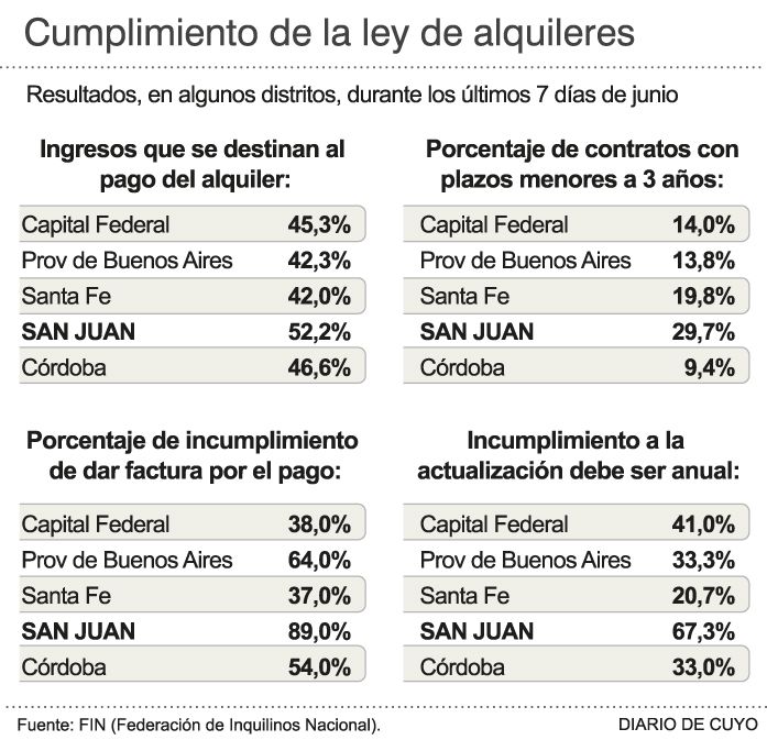 La nueva ley de alquileres sigue generando rispideces entre inquilinos e inmobiliarias, y esta vez el tironeo surgió tras conocerse los resultados de una encuesta realizada por la Federación de Inquilinos Nacional, que señala a San juan entre las provincias con mayor incumplimiento. La encuesta arroja que las inmobiliarias y propietarios incumplen en mas del 80% la obligación de registrar el contrato de alquiler en la AFIP, y entregar factura pro el pago del mes. Además indica que casi un 70% no acató la actualización anual del monto de alquiler que empezó a regir desde este mes, lo que implicaría que siguen con las actualizaciones semestrales que los inquilinos creen que en la sumatoria están por encima de la inflación. El sondeo arroja incluso que hay un 29,7% que siguen haciendo contratos por menos de 3 años, violando la normativa vigente.