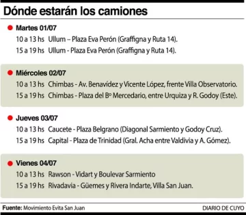 Casi tres meses después de su último desembarco en la provincia, vuelven los ‘Camiones de la Economía Popular’, que recorrerán desde hoy y hasta el viernes seis departamentos (ver aparte cronograma con días y horarios) vendiendo alimentos y hasta productos de limpieza a precios baratos. Por ejemplo, traen ofertas para todos los gustos como el filet de merluza a 36 pesos, el kilo de queso cremoso a 46 pesos o cuatro postrecitos para niños en 16 pesos. El puntapié será hoy en Ullum, mañana recalará en Chimbas, el jueves en Caucete y Capital y el viernes se instalará en Rawson y Rivadavia, según detalló el ‘Movimiento Evita’, a cargo de la logística y organización de este programa social.