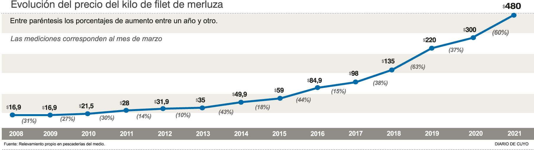 El alimento típico de esta celebración -el pescado- también muestra un incremento importante del 60% teniendo en cuenta que el kilo de filet de merluza pasó de $300 el año pasado a $480 en el 2021. En las pescaderías creen que puede llegar a aumentar para Semana Santa, aunque no demasiado, porque la demanda está deprimida. ""La venta está más tranquila que otros años. Se nota porque la gente paga la comida con tarjeta de crédito", dijeron en Pescadería Gallerano Hnos, en Capital. En igual sentido Roxana González, de Pescadería Argentina, ubicada en el límite con Rawson, contó que la demanda repuntó con el inicio de la Cuaresma el pasado 17 de febrero, pero que al empezar las clases, bajó notoriamente. ""Calculo que algo puede aumentar el kilo cuando llegue el Jueves Santo, pero no más de 30 o 35 pesos. Si baja la demanda y mi negocio compra menos, los proveedores también bajan los precios. Si se mantiene, el precio también seguirá igual", indicó.