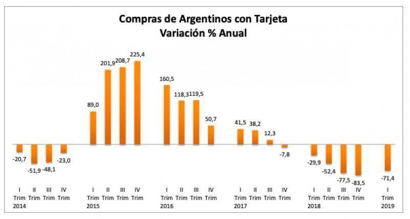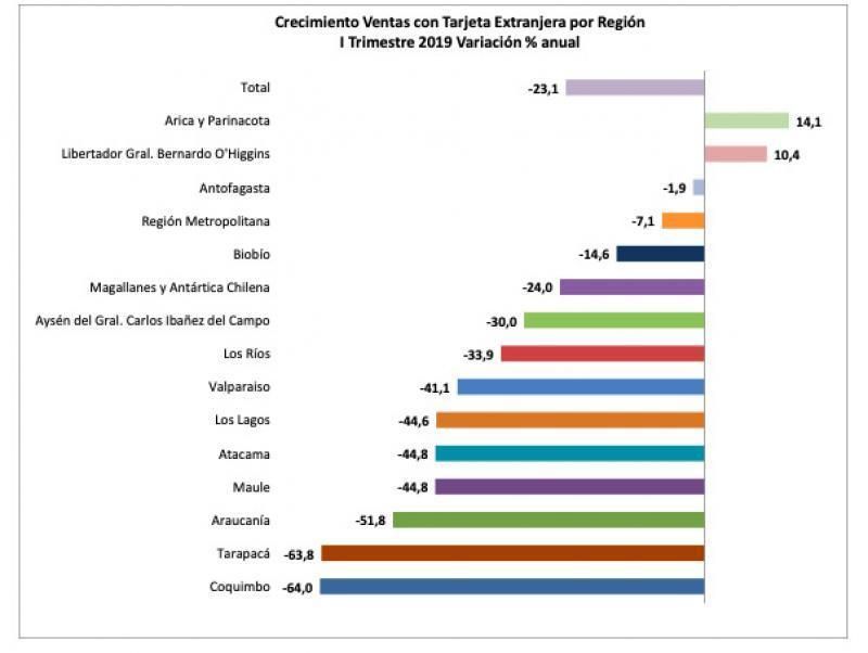 Según el Departamento de Estudios de la Cámara Nacional de Comercio, Servicios y Turismo de Chile (CNC) en los primeros tres meses de 2019, la caída de compras con tarjeta (débito y crédito) extranjera fue de 23,1% y se explica por el descenso 51% de turistas argentinos en Chile en el último verano (enero y febrero). Y esto se reflejó en que durante el primer trimestre el gasto con tarjeta (crédito y débito) de los argentinos en Chile cayó un 71,4%.
