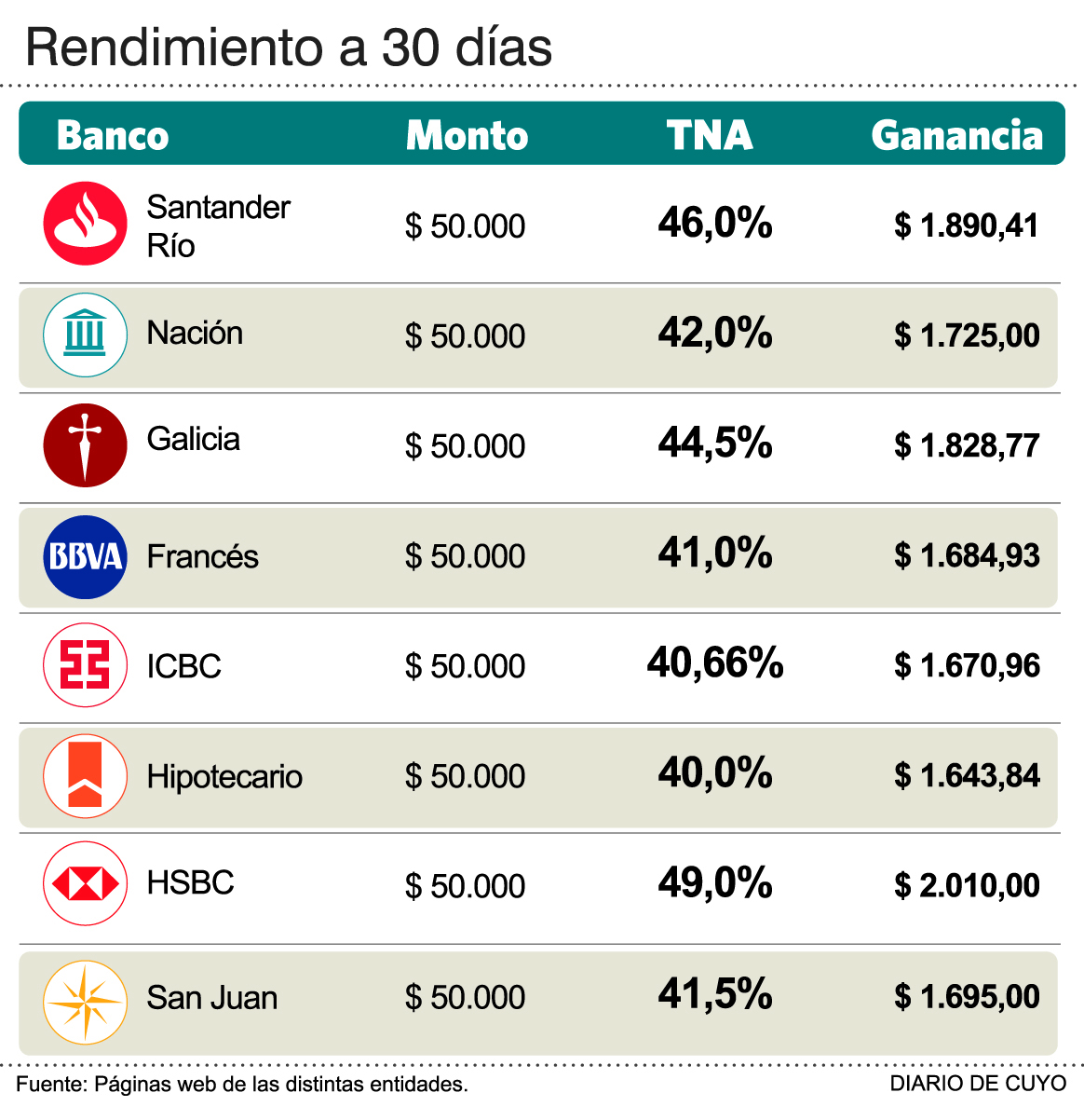 De un relevamiento en las otras entidades que operan en la plaza local y de la consulta a sus páginas web surgió que el que paga la tasa más alta es el HSBC, con un rendimiento del 49%. El Santander, en tanto, pagaba el 46%.