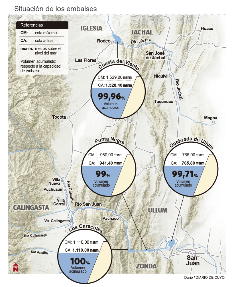 Pero si el almacenaje de agua en esta represa es óptimo, los diques restantes están aún mejor: Caracoles está en su cota máxima, el dique de Ullum al 99,71%; y el de Cuesta del Viento al 99,96 (ver infografía), según datos de la Secretaría de Recursos Energéticos.