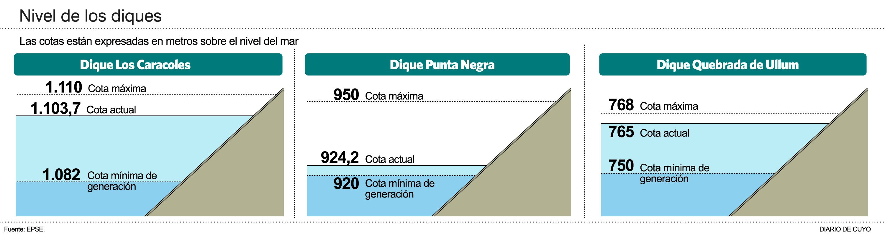 ""Este verano será medio mezquino", graficó el director del EPSE, Carlos Larisson. ""Tenemos cotas bajas en los diques, por lo que estamos generando menos por falta de altura del agua", dijo y agregó que el panorama puede mejorar a principios de febrero. Además de que los niveles de las presas han bajado -especialmente Punta Negra, que tiene 25 metros menos (ver infografía) actualmente hay dos centrales en mantenimiento -Ullum y Cuesta del Viento- y por ende, están sin generar.