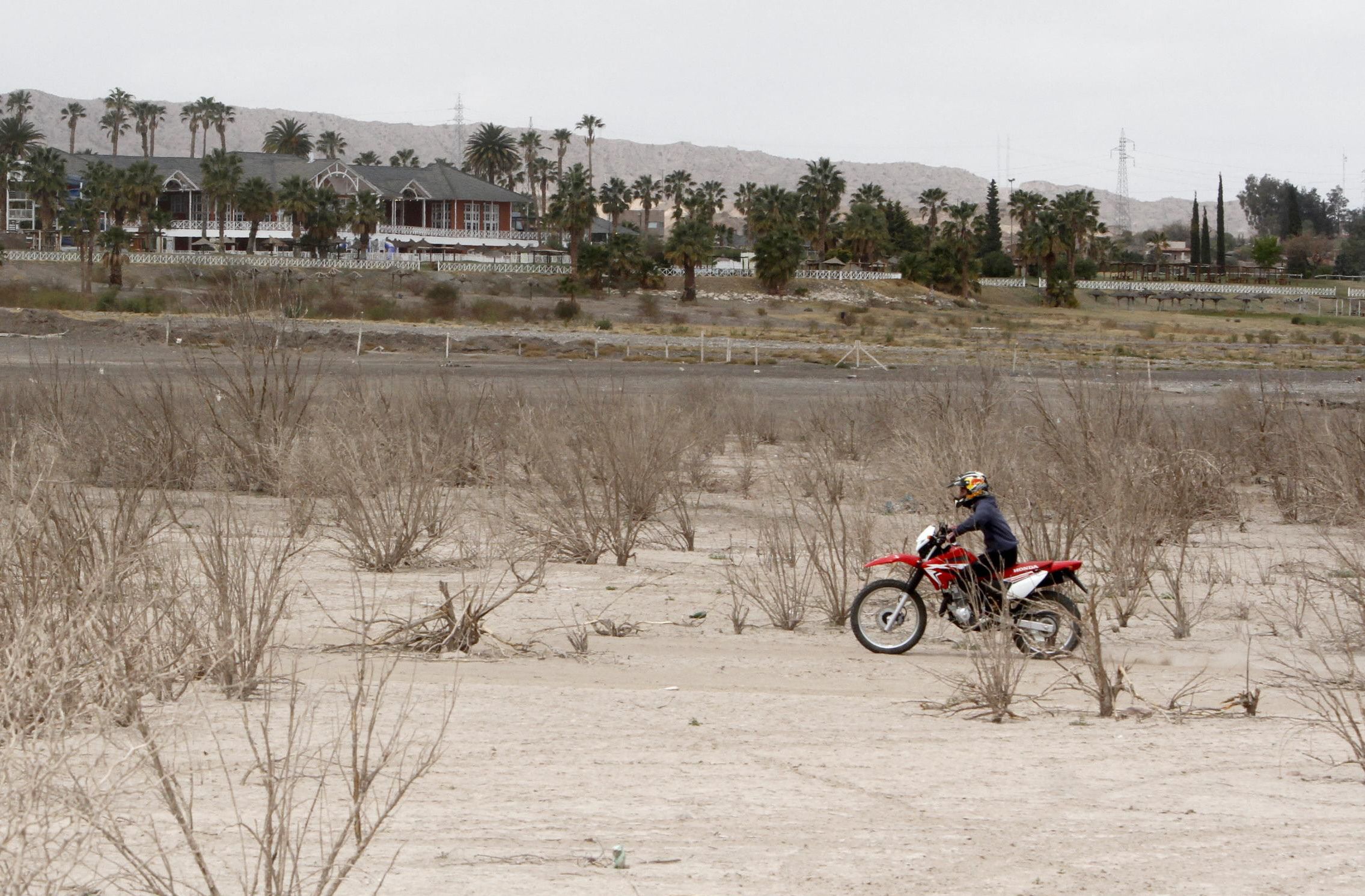 Sequía visible: una moto se desliza por lo que antes era el lago. A lo lejos se puede ver el edificio del complejo Del Bono, que alguna vez estuvo frente al agua.