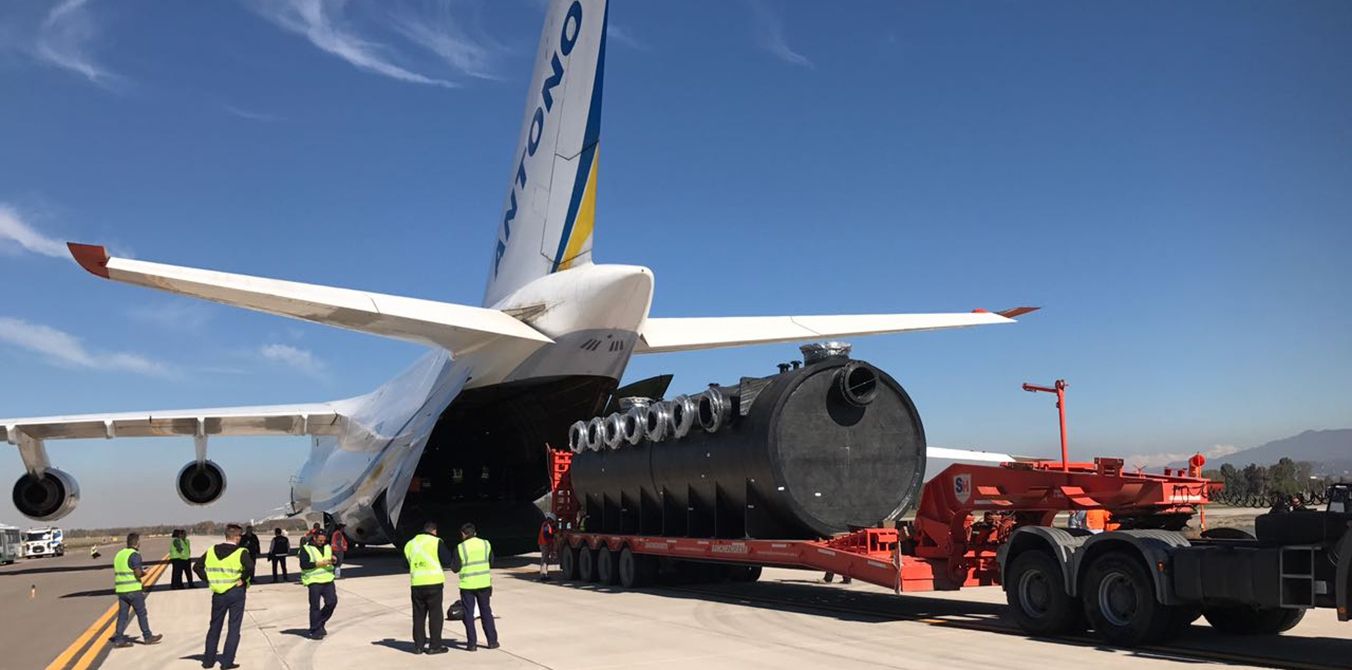 El operativo incluyo la contratación del legendario avión Antonov AN 124, el mas grande del mundo que construyó Rusia en los ‘80 para transporte de carga, para traer desde talleres de Chile al aeropuerto Plumerillo en Mendoza dos piezas únicas: se trata de dos ‘Dropbox’ o Cámaras de Compensación, que permitirán conectar las cañerías viejas del valle de lixiviación, a las nuevas que están siendo colocadas como parte de la exigencia de las autoridades provinciales.