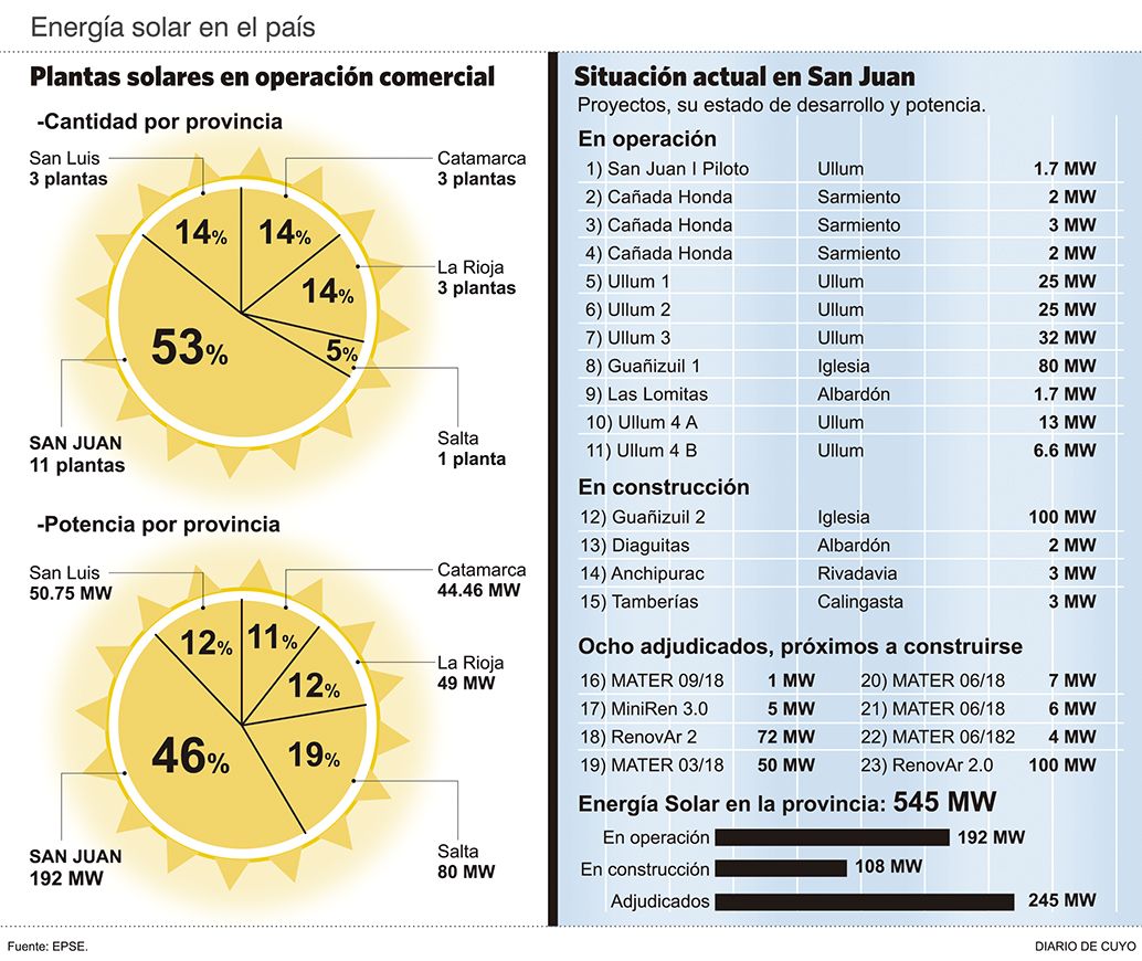 Es inminente la entrada en operación de cuatro granjas solares más (ver infografía). Guañizuil 2, en Iglesia, empieza a funcionar en marzo próximo y aportará 100 MW al sistema eléctrico, y se suma a los 3 MW que empieza a generar el parque Anchipurac, en Rivadavia en enero. En febrero también entran en acción otros 2 MW provenientes de Diaguitas, en Albardón; y los 3 MW de Tamberías, en Calingasta. De esta forma en marzo la generación solar alcanzará los 300 MW superando la producción potencial hidráulica total de la provincia. Cuando se termine la construcción del dique Tambolar que aportara 75 MW la situación quizá cambie, pero no es seguro: hay proyectos solares adjudicados por otros 245 MW, que aun se desconoce cuándo empezarán a construirse. Estos hechos demuestran los cambios que se están dando en San Juan en el sistema eléctrico. El avance de la energía solar de la provincia se debe a una decisión política tomada hace 10 años, de aprovechar el enorme potencial del sol como productor de energías limpias e incentivar la instalación de plantas solares . En el 2009 se diseño el proyecto Solar San Juan, buscando instalar un polo tecnológico fotovoltaico en la provincia. En el 2011 entro en producción la primera planta estatal Ullum 1 y que tras una ampliación en julio de 2018 ya genera 1,7 MW. Ahora la provincia esta haciendo las pruebas finales de otro parque solar estatal, llamado Anchipurac ("Rayo" en lengua huarpe). El resto son todos emprendimientos privados o en asociación con EPSE.